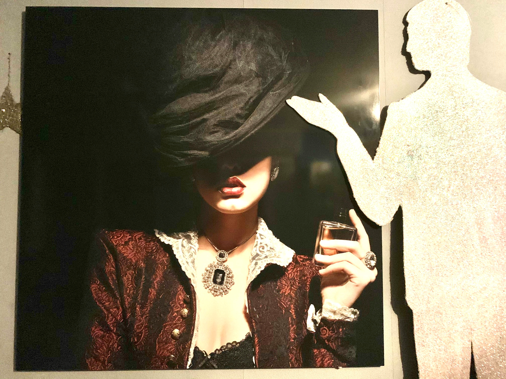 schwarzen Hut ihr Gesicht teils verdeckt. In ihrer Hand hält sie ein (Flacon) Duft Fläschchen und trägt dabei Spitze. Das Portrait